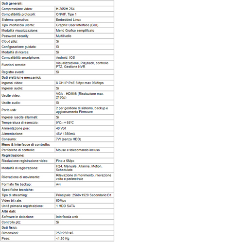 NVR 8CH, 25fps/CH H265, 8 porte PoE, Video Out 4K HDMI