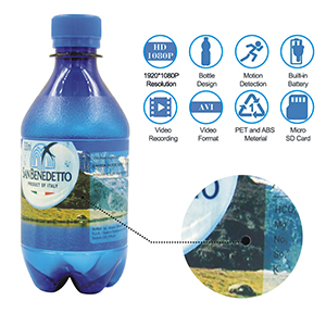 Bottiglia con telecamera nascosta. Video in Full-HD con sensore movimento. Registra su scheda micro-sd.