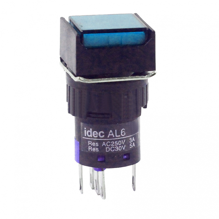 Interruttore luminoso quadrato da pannello - blu. Diametro foro:16mm. Codice: AL6-A. AC 250V 3A. DC 30V 5A.