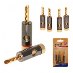 Set 4 spine a banana Dynavox. Spine a banana placcati in oro per cavi fino a diametro 6 mm. Manicotto (LxD) 30 x 11 mm. Lunghezza spina 19 mm. Collegamento a vite. Set di 4 spine ( 2 rosse, 2 nere ). Confezione in blister.