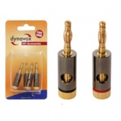 Set 4 spine a banana Dynavox. Spine a banana placcati in oro per cavi fino a diametro 6 mm. Manicotto (LxD) 30 x 11 mm. Lunghezza spina 19 mm. Connessione a vite. Set composto da 2 spine segnate rosso e 2 spine segnate nero. Confezione in blister.