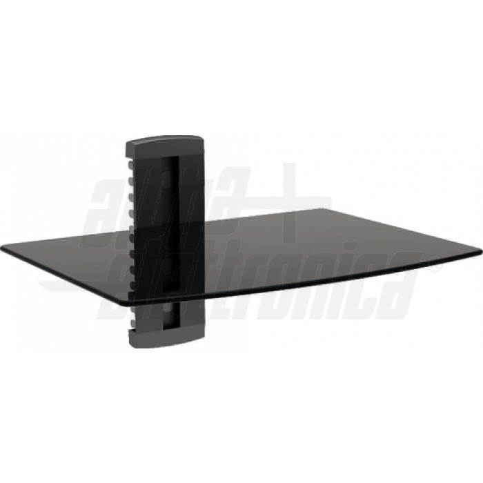 Mensola da muro in vetro e alluminio.Adatto per appoggiare un dispositivo audio-video.Posizione mensola regolabile.Barra nascondi cavi 22cm inclusaDimensioni piano di appoggio: 380*280mmSpessore vetro: 5mm