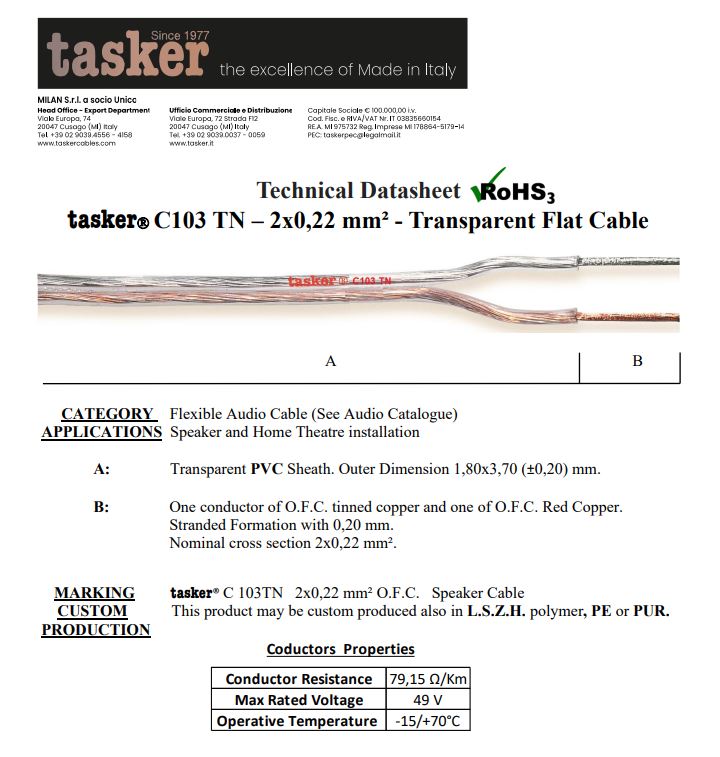 Piattina trasparente Normale (TN) bipolare divisibile per applicazioni elettroniche, riproduzione sonora e sistemi Hi-Fi Home e Car.