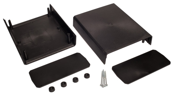 Contenitore in polistirene (C8H8)n con pannelli laterali colore nero.