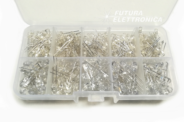 Valigetta in plastica organizzata in scomparti contenente 300 LED da 3 e 5 mm con assortimento nei colori rosso, blu, giallo, verde e bianco. 40 LED per colore da 3mm, 20 LED per colore da 5mm.