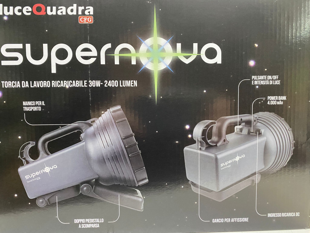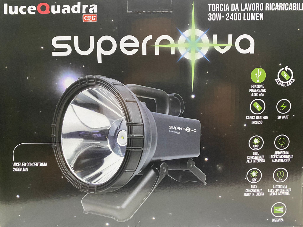 TORCIA LED SUPERNOVA RICARICABILE30W 2400LUMEN E 850LUMENDISTANZA 1500MTDOPPIA ILLUMINAZIONEPOWERBANK 4000MAH