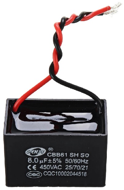 CONDENSATORE DI SPUNTO 8UF 450VACAdatto per ventilatori, condizionatori ed elettrodomestici vari in corrente alternata fino a 450VAC