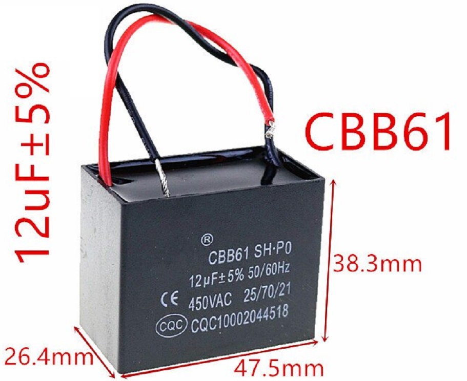 CONDENSATORE DI SPUNTO 12UF 450VACAdatto per ventilatori, condizionatori ed elettrodomestici vari in corrente alternata fino a 450VAC