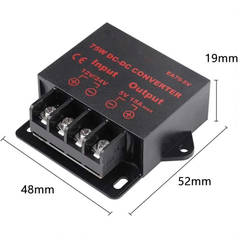 MODULO CONVERTITORE STEP DOWNTENSIONE IN INGRESSO: 24VDCTENSIONE IN USCITA: 12VCORRENTE MASSIMA: 5APOTENZA MASSIMA: 60WIL FISSAGGIO DEI CAVI AVVIENE TRAMITE MORSETTIERA A VITEDIMENSIONI: 4.8X5.2X1.9cm