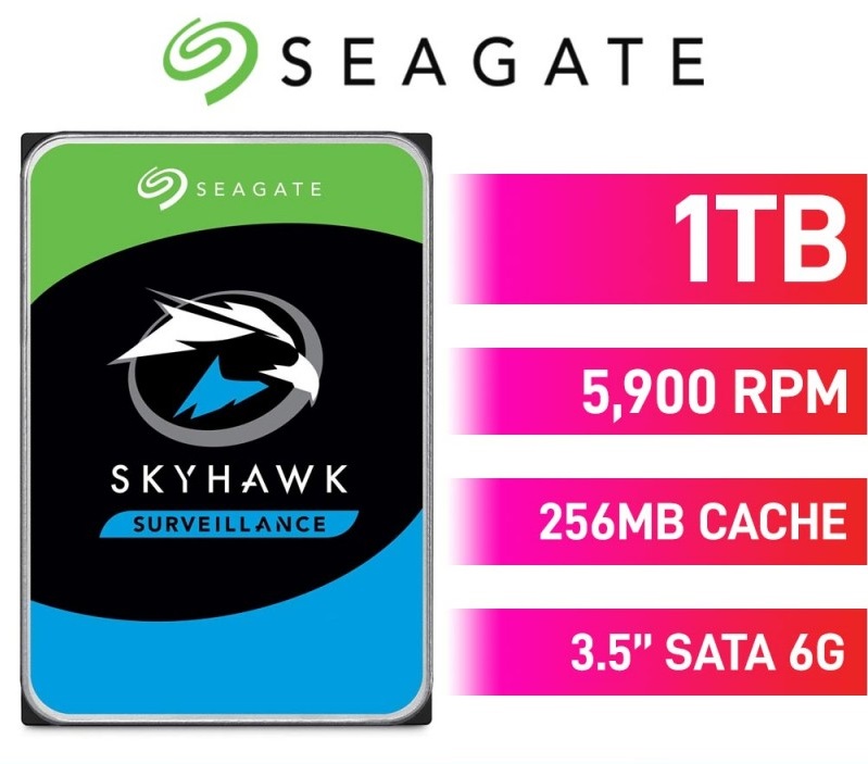 Seagate SkyHawk ST1000VX013 Hard Drive- 1TB Capacity- 3.5" Form Factor- Interface: SATA 3.0 6Gb/s- 256MB Cache- 5900 RPM Spindle Speed- Up to 180 MB/s Transfer Speed- CMR Recording Technology- Cameras Supported: Up to 64