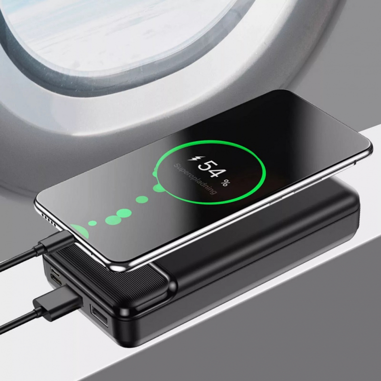 Batteria esterna con una capacità di 20000mAh e con doppia uscita USB/A, uscita USB type-c ed uscita MicroUSB per ricaricare almeno 2 dispositivi contemporaneamente.