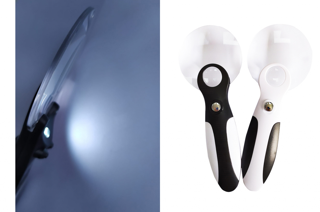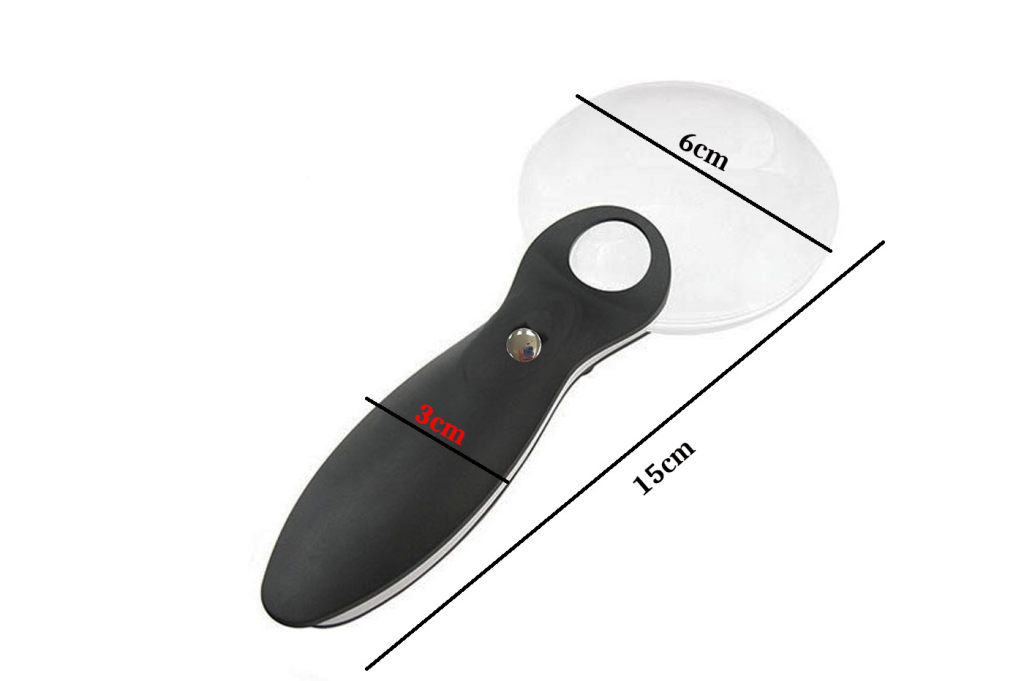 Lente di ingrandimento con luce led Alimentazione a batteria: 2x2032 (incluse) Interruttore frontale Colore: bianco e nero, giallo e bianco Dimensione: h 15 x l 6 cm circa