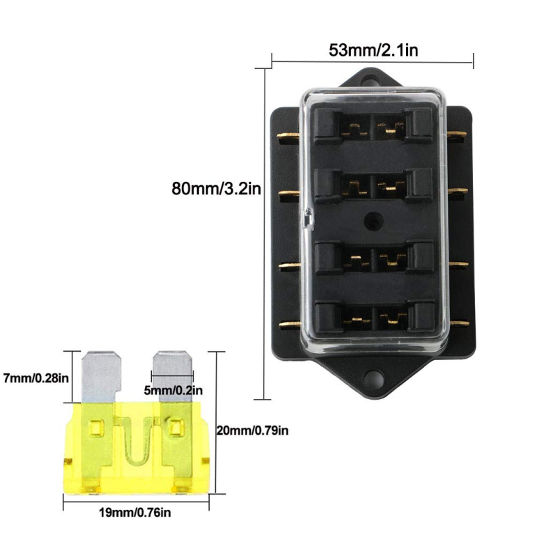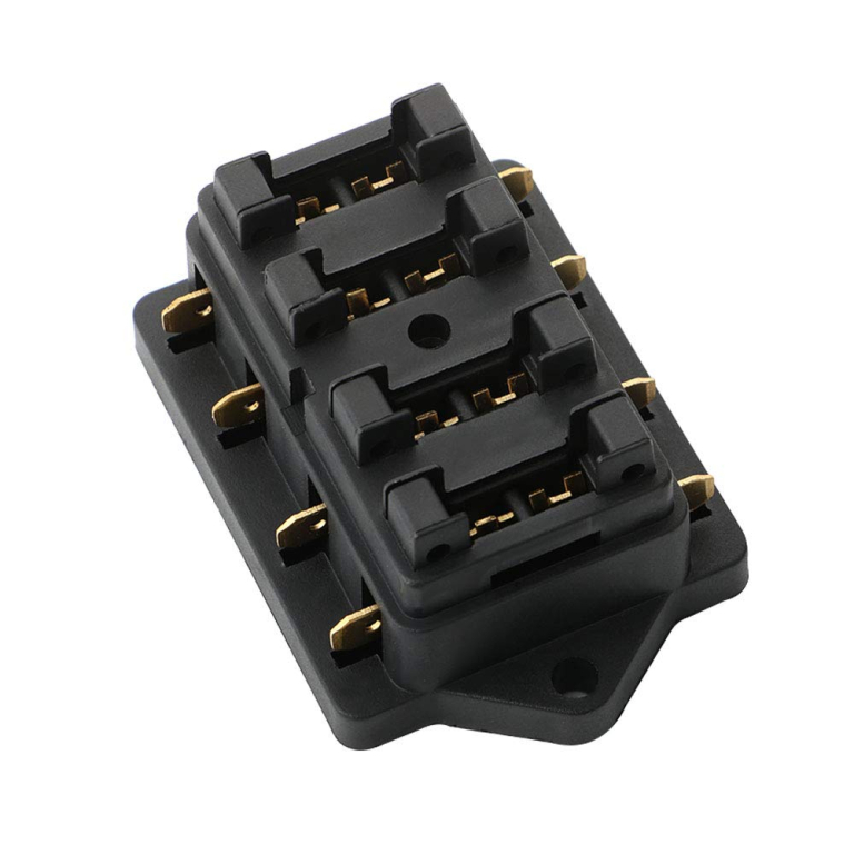 PORTAFUSIBILI A LAMA 4 VIE CONTATTI 6,3mm 12/24VDC MAX 40A +4 FUSIBILI
