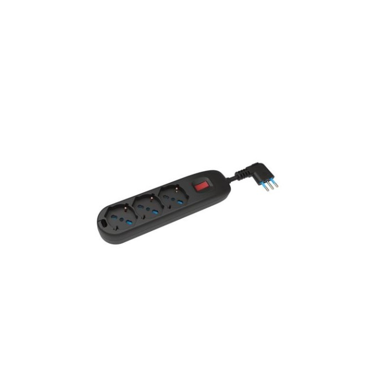 MULTIPRESA 3 POSIZIONI SCHUKO + BIPASSOCON INTERRUTTORESPINA 10A 90°CAVO 1,5MTPORTATA MASSIMA 2500WCOLORE NERODIMENSIONI 21X5X3.5CM