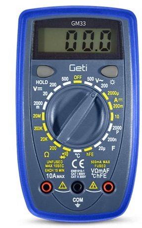 Il multimetro GETI GM33B può essere utilizzato per misurare un'ampia gamma di grandezze elettriche come: tensione (DCV e ACV), corrente (DCA), resistenza, capacità e molte altre.Il display chiaro, completo di retroilluminazione, garantisce una leggibilità facile e precisa dei valori misurati anche in condizioni di scarsa illuminazione. Il dispositivo è inoltre dotato di altre pratiche funzioni, come l'indicazione di batteria scarica, la protezione da sovraccarico, il test dei diodi, la misurazione della continuità o il test dei transistor, che conferiscono al multimetro un carattere user-friendly che, grazie alle sue dimensioni compatte e al peso leggero, garantisce una facile maneggevolezza anche in luoghi difficili da raggiungere.Tutte queste caratteristiche rendono questo dispositivo un aiuto versatile, non solo in officina, ma anche a casa