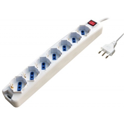 Dati tecnici: presa multipla con interruttore luminoso, spina standard italiano 2p+t 16 a, 1,5 metri cavo 3 x 1,5 mmq, sette prese multistandard tedesco e italiano a ricettività multipla 2p+t 10/16 a con alveoli schermati, colore bianco.