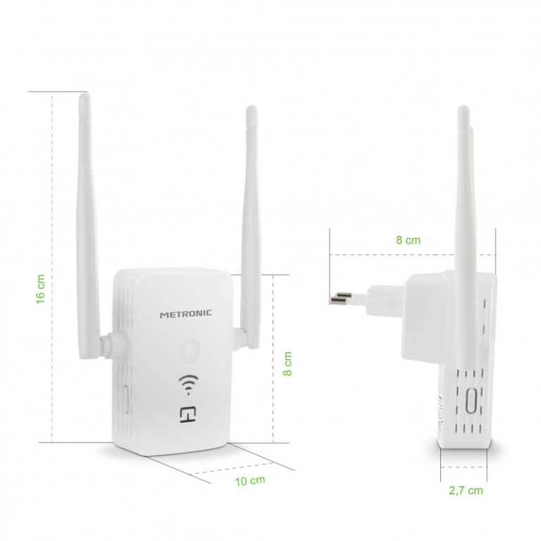 Il ripetitore Wi-Fi 1200 METRONIC potenzia il segnale Wi-Fi aumentando velocità e copertura per raggiungere le stanze più lontane dal modem. Questo ripetitore permette di raggiungere una velocità di connessione fino a 1200Mbit/s per guardare film HD in streaming in soggiorno o giocare online in giardino, senza perdita di prestazioni. E' sufficiente posizionare il ripetitore in un punto coperto dalla rete wi-fi esistente per consentire la diffusione in zone in cui il segnale non è presente o arriva con difficoltà. Ideale per la mansarda, la taverna, il garage, il giardino, … Per avere il segnale Wi-Fi ovunque lo si desideri. Si tratta di dispositivo dual-band (2,4 GHz o 5 GHz) che permette di godere della connessione migliore senza interruzioni. È, inoltre, possibile controllare la qualità del segnale grazie ai led integrati. Compatibile con tutti i modem e device con connessione Wi-Fi, ad esempio smartphone, tablet, computer portatili, chromecast, fire TV, ecc… Installazione facilitata con tasto WPS