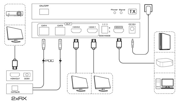 Consente di inviare un singolo segnale HDMI su 2 schermi fino ad una distanza massima di 50mt, mediante cavo CAT6 |