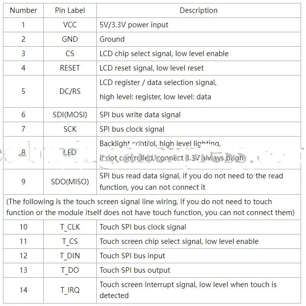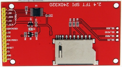 DISPLAY LCD TFT 2,4" PER ARDUINORGB 65K COLORIRISOLUZIONE 320X240INTERFACCIA SPI 4 PINDIMENSIONI MODULO 77.18X42.72mmDIMENSIONI SCHERMO 36.72X48.96mmTENSIONE DI LAVORO 3.3VDC-5VDCTENSIONE PORTA LOGICA IO 3.3V (TTL)TABELLA RELATIVA AI CONTATTI