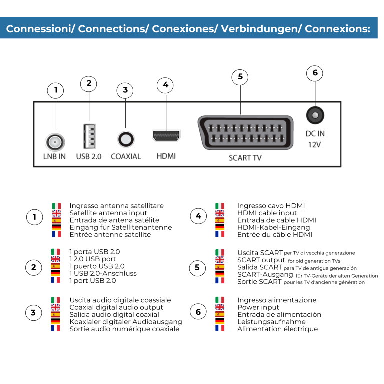-Mediaplayer e Network APP: Riproduci video, musica e immagini direttamente da USB e accedi alle app del decoder per un’esperienza multimediale completa. Inoltre, è compatibile con connessione WiFi tramite dongle USB (non incluso).