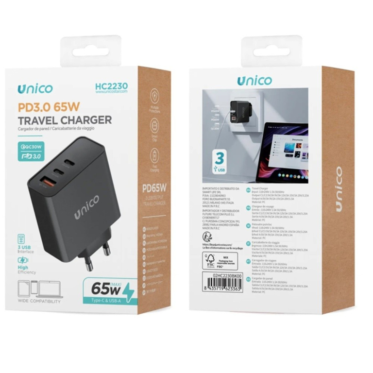 CARICATORE DA MURO PRESA USB/A QC3.0 + 2X TYPE-C 5VDC PD 65W NERO