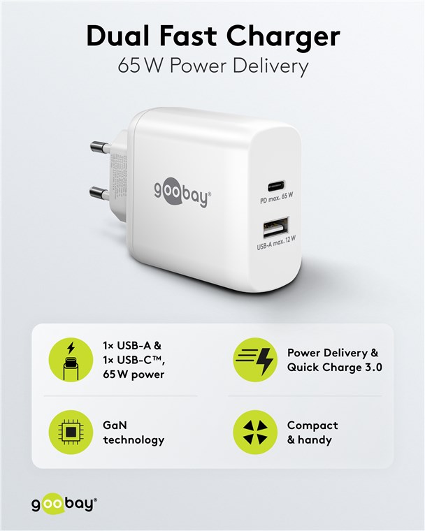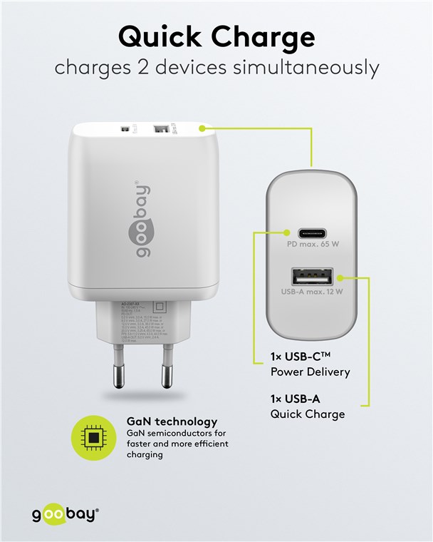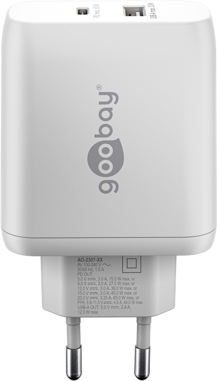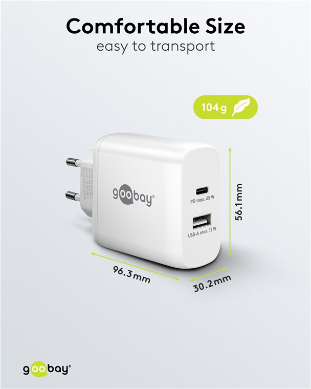 Con una potente uscita da 65 W e porte USB universali, il caricabatterie da parete è adatto praticamente a qualsiasi dispositivo, dagli smartphone ai notebook ad alte prestazioni