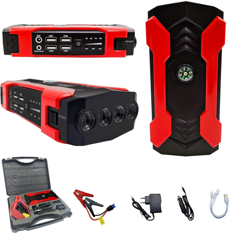MULTIFUNZIONE 6 IN1 Avviamento di emergenza + power bank portatile + torcia a LED + segnale luminoso di aiuto SOS + 4 porte USB + alimentazione elettrica del veicolo.