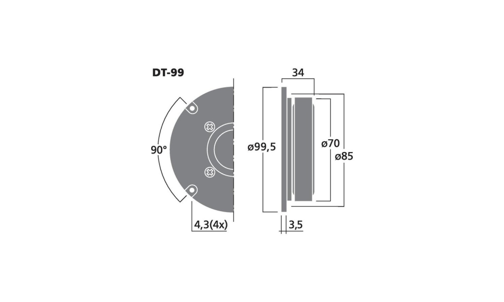 Impedenza (Z) 8? Frequenza di risonanza (fs) 1500 Hz Banda passante fx-20000 Hz Frequenza di taglio cons. (fmax.) 2500 Hz Potenza max. 50WMAX Potenza nominale 30WRMS SPL (1 W/m) 90dB Diametro bobina mobile 25,4mm Diametro magnete 70mm Apertura di montaggio 72x80mm Profondità di montaggio 30mm Dimensioni (lxhxp) ø 100mm Peso 0,5kg