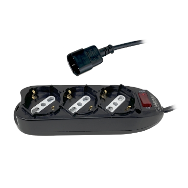 Multipresa 3 posti tripasso 10/16A/SCHUKO e spina IEC per connessione ad UPS.