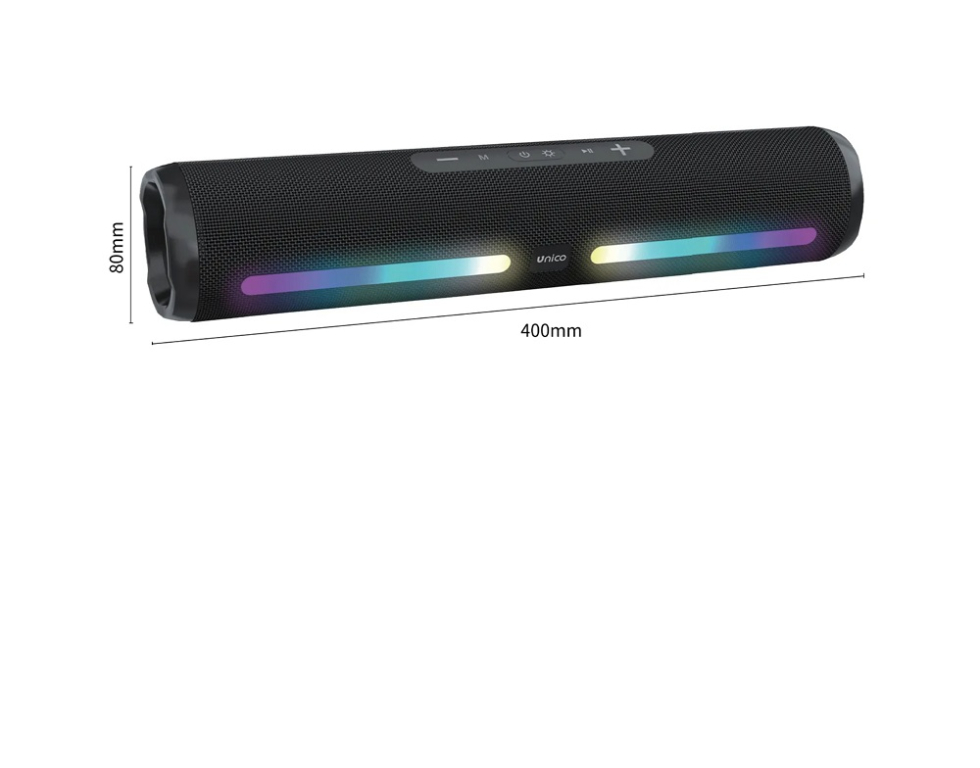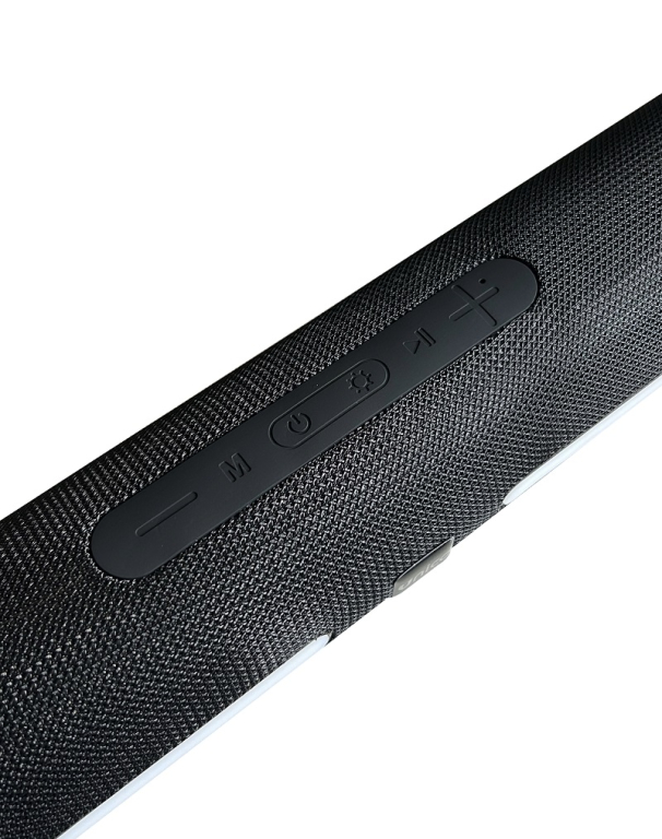Soundbar ricaricabile dalle dimensioni ridotte con connessione Bluetooth, ingresso USB/A, presa AUX, slot per memory card e presa type-c per la ricarica.
