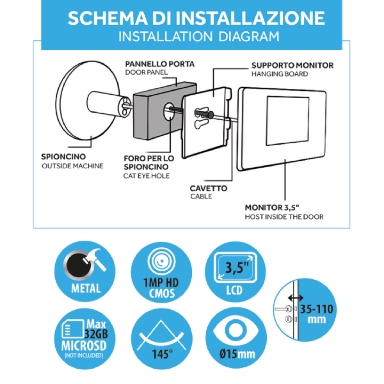 Spioncino digitale facile da installare e compatibile con la maggior parte delle porte sul mercato (diametro 15mm e spessore porta da 35 a 110mm).