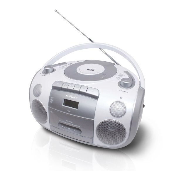 Radioregistratore con cd-mp3, presa usb, card reader, radio am/fm, piastra di registrazione auto-stop, display lcd, presa cuffia, funzione bass boost, colore bianco - silver, alimentazione a rete o batteria.